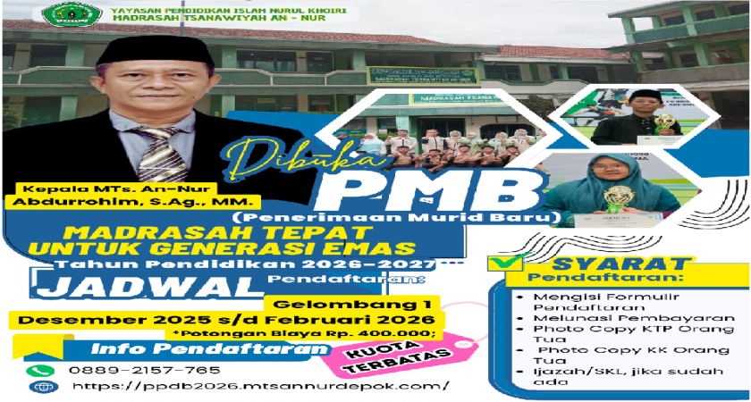 Info dan proses Penerimaan Siswa Baru 2026/2027 dapat menggunakan link dibawah ini :  https://ppdb2026.mtsannurdepok.com/